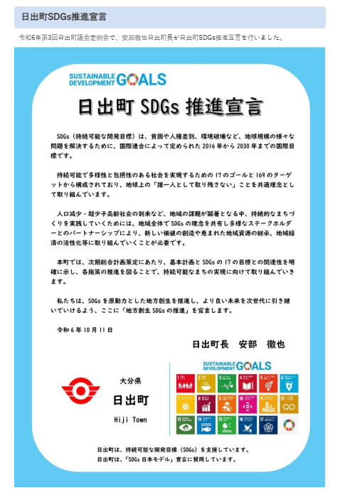 本町では、これまで、令和6年10月の「日出町SDGs推進宣言👉」、12月の「ゼロカーボンシティ宣言👉」に見るように、主に理念の共有や啓発に取り組んできましたが、今後は、未来都市に選定されたことで、町民の皆さんが実際にその成果を実感できるような、「経済・社会・環境を統合する事業」が展開されていくと大いに期待しています。